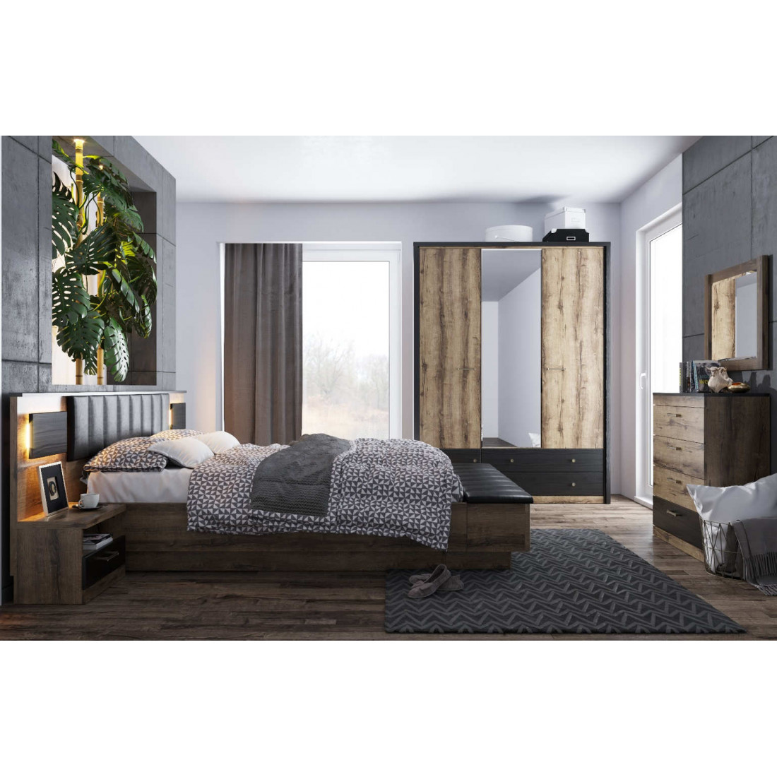 Отличительная черта спальни Джаггер - сочетание контрастов. Это современная мебель, которая хорошо смотрится как в современном, так и в классическом интерьере. Эта многомерность и универсальность были достигнуты благодаря умелому сочетанию дуба монастырского и части фасадов, поддерживаемых в черном цвете.
