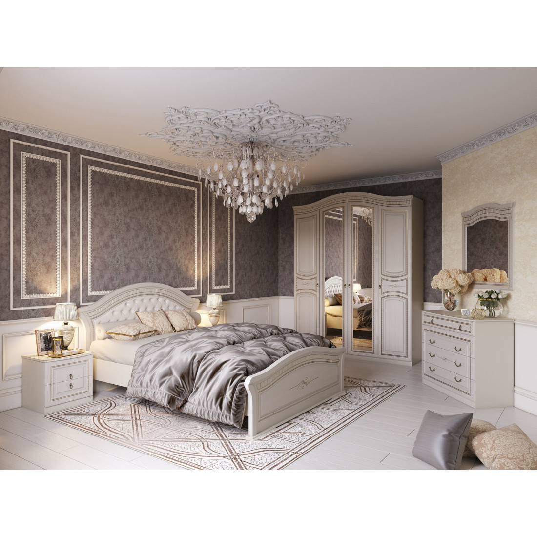 Спальня Николь изготовлена в теплых светлых оттенках и создает атмосферу уюта и спокойствия. Оригинальный декор и мягкое изголовье с декоративными утяжками на кровати придает ей неповторимость. С этим гарнитуром ваша спальная комната будет выглядеть роскошно и изящно.